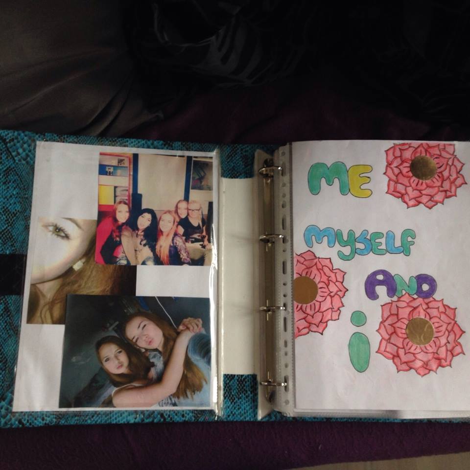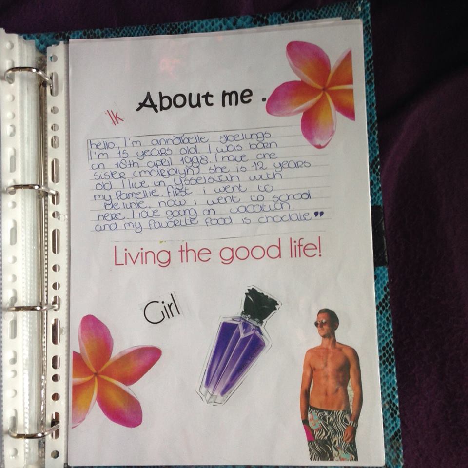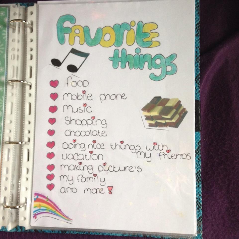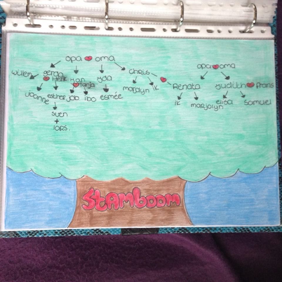 We moesten als eerst de kaft van een map ontwerpen met stof. Daarna moest je het gemaakte werkstuk in de map doen. Een opdracht was bijvoorbeeld een stamboom maken, een plattengrond van je kamer, een foto van je kluisje, een lijstje van dingen die je leuk vind om te doen enzovoort.